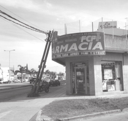 Desde el temporal del 29 de octubre, estos dos postes de tendido eléctrico quedaron apoyados por 20 días contra la Farmacia Caridade Fernandes, en la Avenida Eva Perón.